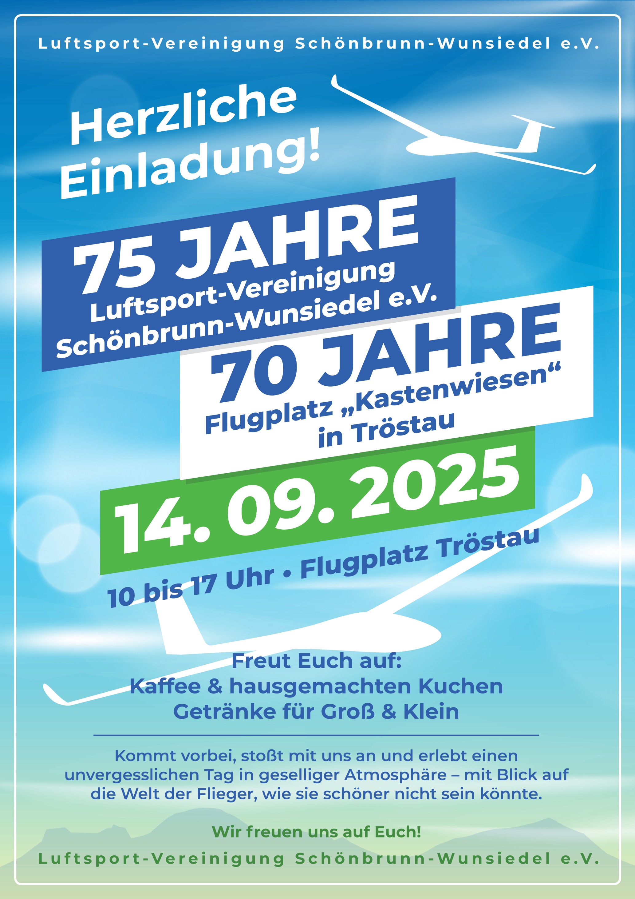 Wir laden daher alle herzlich ein, mit uns am 14.09.2025 auf unserem Flugplatz in Tröstau das 75-jährige Bestehen unseres Vereins zu feiern!