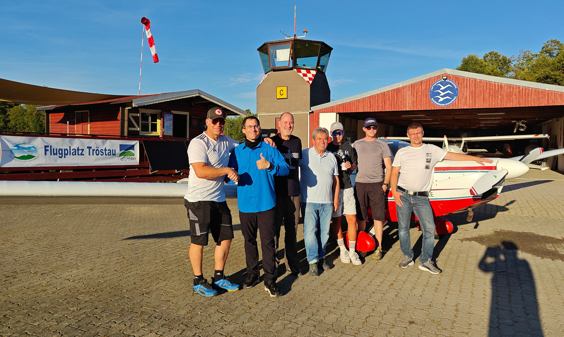 Während des Sommers standen immer wieder Schulflüge auf dem Programm, sowohl alleine als auch in Begleitung des Fluglehrers. Darunter die Vorbereitung und Durchführung von Flügen über längere Distanzen, Landungen auf anderen Flugplätzen und bei verschiedenen Windbedingungen. Dank der guten Vorbereitung durch Fluglehrer und Ausbildungsleiter Michael Kusa (2. v.l.) meisterte der Prüfling die Abschlussprüfung ohne Schwierigkeiten. Die Vereinskameraden gratulieren herzlich und wünschen viele sichere Landungen und eindrucksvolle Flüge.